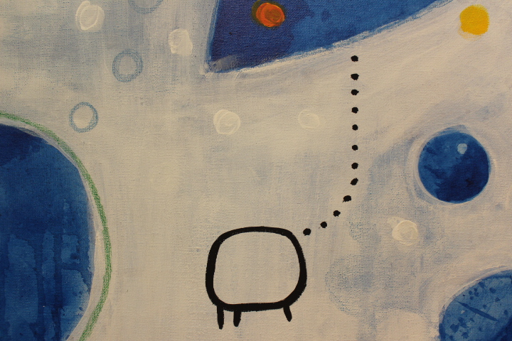 Dominantna linija koja u dva navrata, ali na dva načina, oblikuje anđele, jednom ponavlja tematiku muzikalnosti, drugi put udvaja dostojanstvo iste figure različitim izborom boje. Organska apstrakcija dojmljivo raspoređenih plavih bića na bijeloj podlozi jasno pokazuje moderna izvorišta, dok integracija stihova u okvir toplome unutrašnjem svjetlu nalazi uzore u nekima od suvremenih slikarskih kretanja. Prožimanje motiva jedinstvenim, a opet prepoznatljivim likovnim jezikom svakako odlikuje upečatljivije od navedenih i ostalih izloženih slikarskih i skulptorskih ostvarenja.
