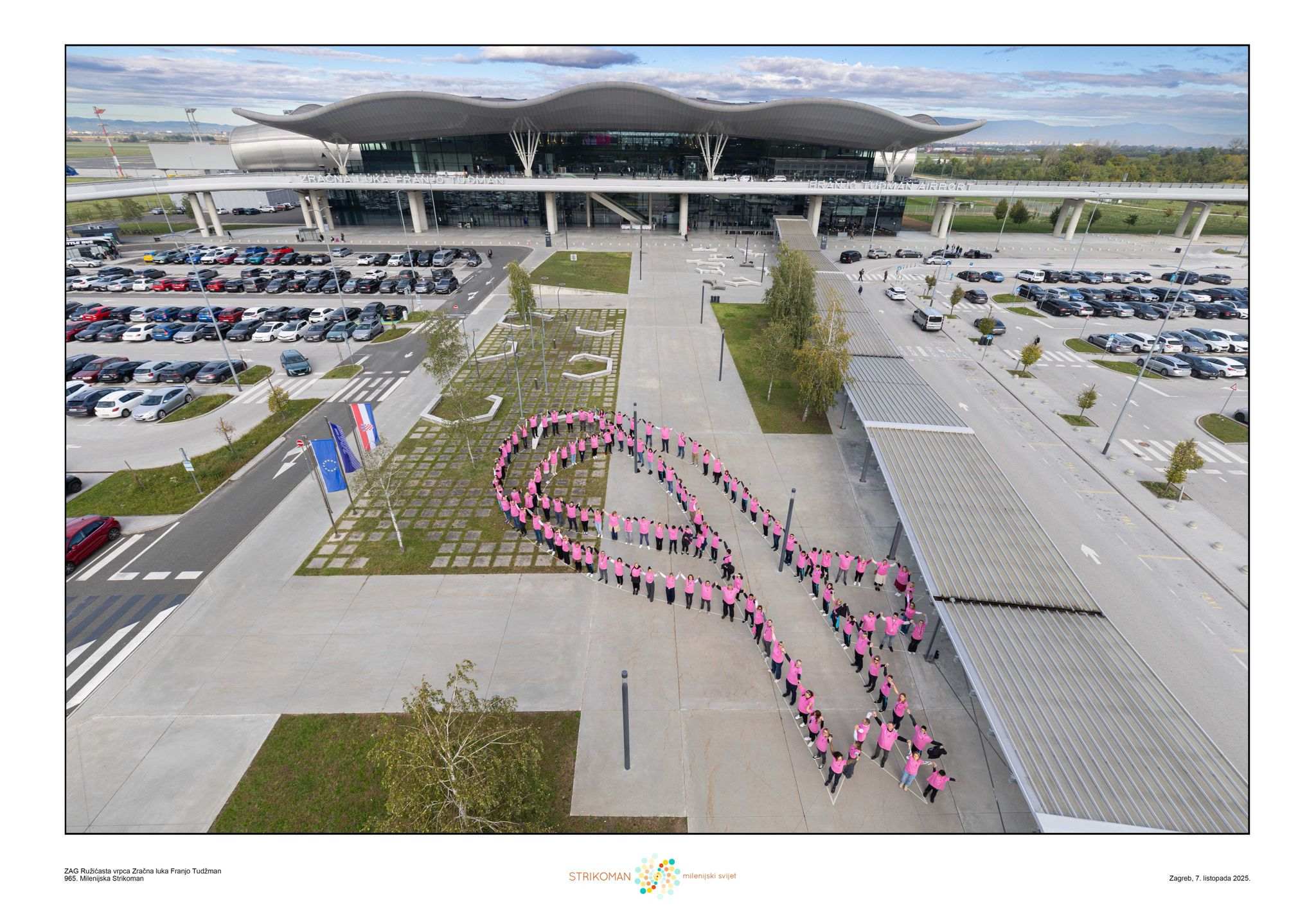 Zračna luka Franjo Tuđman u Velikoj Gorici postala je kulisa za 965. milenijsku fotografiju Šime Strikomana, koja simbolizira borbu protiv raka dojke. Ispred putničkog terminala, zaposlenici zračne luke te partnera poput Havas-Zemaljskih usluga, BTA Hrvatska, SDA Hrvatska i IAAC-a, okupili su se u roza majicama i oblikovali prepoznatljivu ružičastu vrpcu.