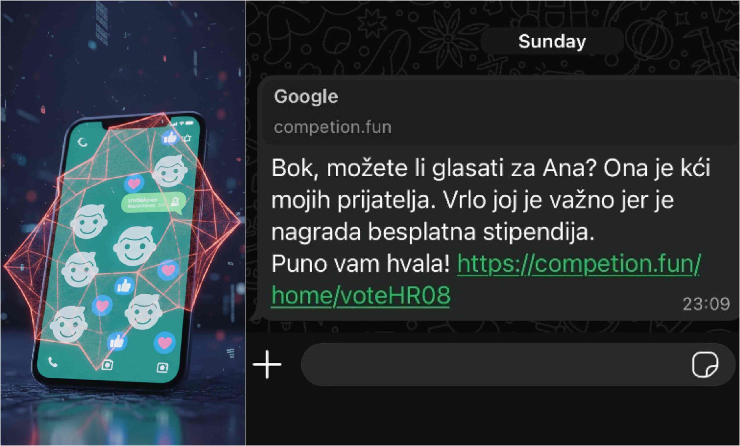 Centar za sigurniji internet izdao je hitno upozorenje zbog intenzivnog širenja nove online prijevare koja putem WhatsApp poruka cilja na empatiju i povjerenje građana. Napadači koriste emocionalnu manipulaciju tražeći od korisnika da daju svoj glas za dijete u navodnom online natjecanju, što je zapravo paravan za preuzimanje kontrole nad njihovim korisničkim računima.